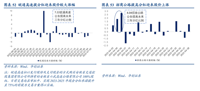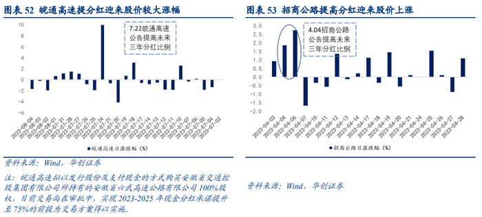 我们还观察到:现金分红比例的提高往往能直接带动股价提升,2023年以来招商公路、皖通高速股价均在宣布提高分红比例后迎来上涨。