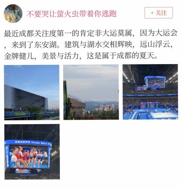 网友“不要哭让萤火虫带着你逃跑”:“最近成都关注度第一的肯定非大运莫属,因为大运会,来到了东安湖。建筑与湖水交相辉映,远山浮云,金牌健儿,美景与活力,这是属于成都的夏天。”