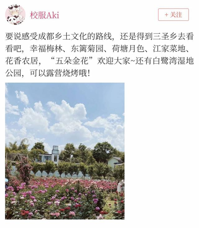 网友“校服Aki”:“要说感受成都乡土文化的路线,还是得到三圣乡去看看,幸福梅林、东篱菊园、荷塘月色、江家菜地、花香农居,‘五朵金花’欢迎大家,还有白鹭湾湿地公园,可以露营烧烤哦!”