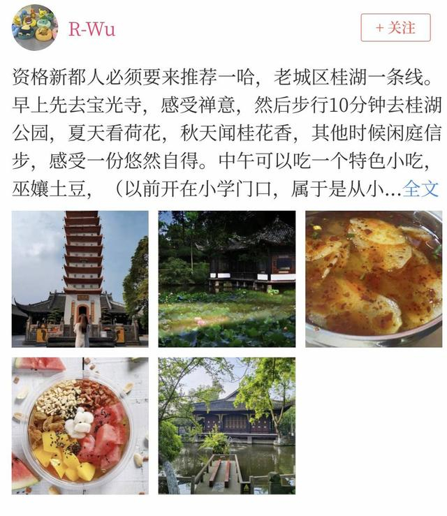 网友“R-Wu”:“作为资格的新都人,想推荐老城区桂湖一条线。早上先去宝光寺,然后步行10分钟去桂湖公园,夏天看荷花,秋天闻桂花香,感受一份悠然自得。中午可以吃一个特色小吃,巫孃土豆或者四喜冰粉。下午可以从新桂湖走到老桂湖玩,87年红楼梦部分取景地就在这儿!晚上再去好吃街或者商场吃饭都得行。”