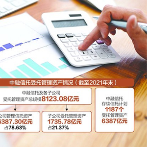 截至2021年末,中融信托自有资产327.16亿元(合并),公司及各子公司受托管理资产总规模8123.08亿元。受托管理资产中,公司管理信托资产6387.30亿元,占78.63%;子公司受托管理资产1735.78亿元,占21.37%。公司实现营业总收入58.58亿元(合并)。公司本部净资产193.08亿元,净资本150.79亿元,净资本覆盖率144.55%,净资本盈余46.47亿元。