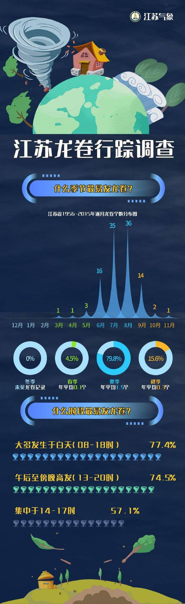 昨天@江苏气象也发布了江苏龙卷数据揭秘,据对1956年至2015年江苏龙卷次数月度统计,我省在夏季(6、7、8月)最易发生龙卷风。龙卷风高发区主要分布在里下河地区以及南通、泰州、扬州和苏州北部。江苏地势较为平坦,河流湖泊密集,加上地处南北气候过渡带,冷暖气流频繁交汇,这些都是龙卷风等强对流天气发生的原因。