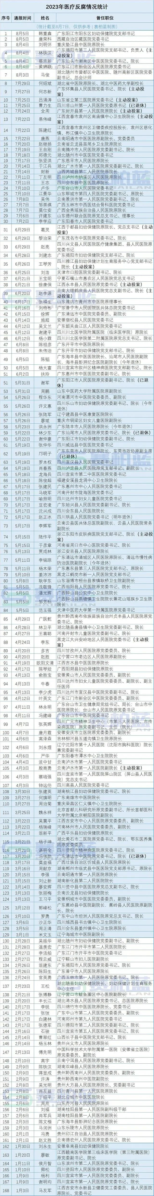 据统计,截止到8月12日,今年以来全国已有176名医院的书记院长被查。不止如此,除医院书记院长外,还有医疗系统的很多干部落马被通报。虽然我们国家医疗领域反腐一直没断,但像今年“扫黑除恶”式的医疗领域反腐还是极为罕见的,或者说是前所未有的。