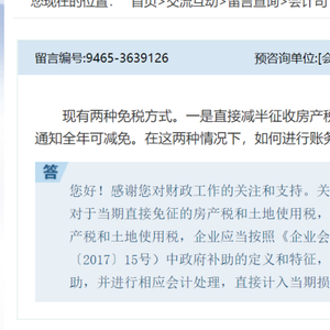 财政部会计司答:对于当期直接免征的房产税和土地使用税,企业无需进行账务处理。对于先征后返的房产税及土地使用税,企业应当按照《企业会计准则第16号一一政府补助》(财会 (2017) 15号) 中政府补助的定义和特征,根据交易事项的实质判断是否属于政府补助,并进行相应会计处理,直接计入当期损益或冲减相关费用。