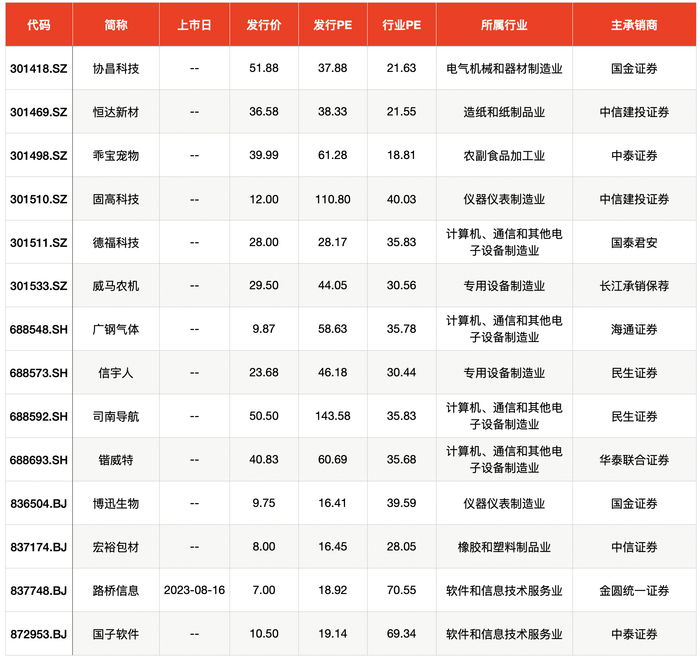 截至8月13日,A股共有3只股票已公布上市计划,固高科技股份有限公司(简称“固高科技”,301510.SZ)、广州广钢气体能源股份有限公司(简称“广钢气体”,688548.SH)将于本周二(8月15日)上市,厦门路桥信息股份有限公司(简称“路桥信息”,837748.BJ)将于本周三(8月16日)上市。