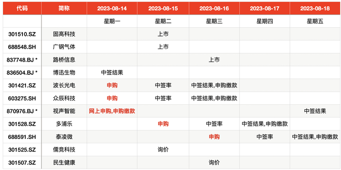 本周新股申购迎来多只龙头股。澎湃新闻根据Wind及公开信息梳理统计,本周(8月14日-8月18日)共5只A股新股网上申购,比上周(8月7日-8月11日)减少了2只。不过,国内精密光学元件组件主要供应商、国内超声无损检测设备领先供应商、国内领先的无线物联网SoC芯片设计企业均在本周申购。