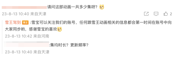 有粉丝在官微询问这部动画的总集数、每集时长、更新频率等相关问题,结果雪王大打太极:“雪宝(雪王粉丝昵称)可以关注我们的账号,任何跟雪王动画相关的信息都会第一时间在账号中向大家同步哟。”