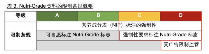 如果饮料属于C和D这两个等级,那包装上就必须标注,而且属于D级的饮料还不能做广告,像电视、报纸、电影院、地铁,还有抖音、小红书这样的社交媒体上都不能做D级饮料的广告。