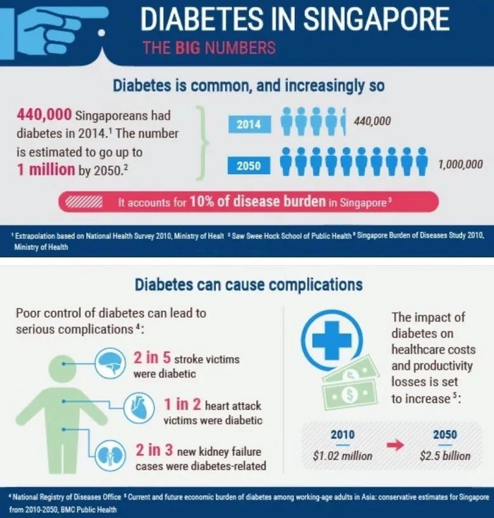 他们的糖尿病患病率也很高,大概在8%左右,如果不采取任何措施,到2050年,预计将有约100 万新加坡人患有糖尿病。[3]