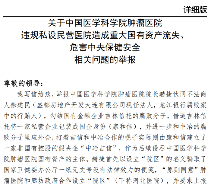 据网络间流传的举报信,举报人直指中国医学科学院肿瘤医院院长赫捷伙同不法商人徐某民,勾结国有金融企业吉林信托的腐败分子,借道吉林信托将一家私营企业包装成国企身份(康和信),并进一步和中冶的腐败分子里应外合,打着吉信和中冶合作的幌子实际则由康和信建立了一家非国有控股的假央企“中冶吉信”,作为后续侵吞中国医学科学院肿瘤医院国有资产的主体。