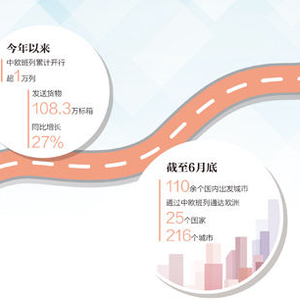 截至6月底,已有110余个国内出发城市通过中欧班列通达欧洲25个国家216个城市,为经贸往来注入源源不断的活力。