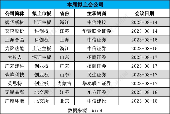 本周,A股市场有10家公司迎来首发上会,数量较前几周迎来明显回升。上述10家拟上会公司中,分别为来自沪深主板的巍华新材等3家公司,创业板的森峰科技等3家公司,科创板的艾森股份和上海合晶,以及北交所的无锡晶海和广厦环能。