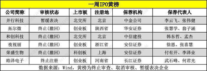 上周,总共有6家公司入列“黄榜”,除了暂缓表决的并行科技外,还有主动撤回IPO项目的拓尔微等4家公司,以及终止注册的皓泽电子。