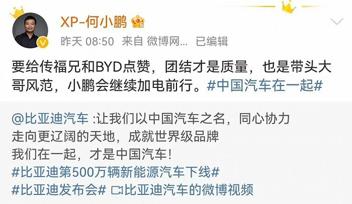 虽然,小鹏汽车董事长何小鹏回应称,要给传福兄和BYD点赞,团结才是质量,也是带头大哥风范,小鹏会继续加电前行。比亚迪可能也想当新能源汽车的带头大哥,但又没完全说。