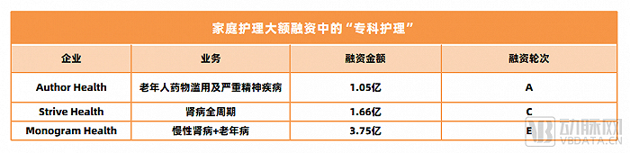 在上半年的7笔融资中,我们注意到Author Health、Monogram Health、Strive Health3个聚焦于家庭护理中某类慢病管理的项目,实际上是基于国情,在“互联网+护理”赛道中的“专科护理”领域里的探索。