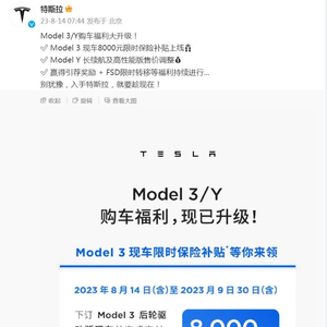 特斯拉官方微博8月14日消息,特斯拉Model 3现车8000元限时保险补贴上线。同时,2023年8月14日起,Model Y长续航版起售价从31.39万元调整为29.99万元,Model Y高性能版从36.39万元调整为34.99万元。