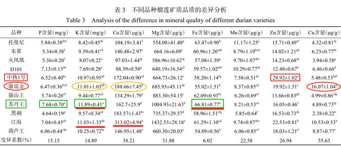 品种“中热1号”的锌元素含量最高,在测试样本中含量达到28.92μg/g,显著高于其他测试品种样本,还有丰富的钾元素、磷元素等。