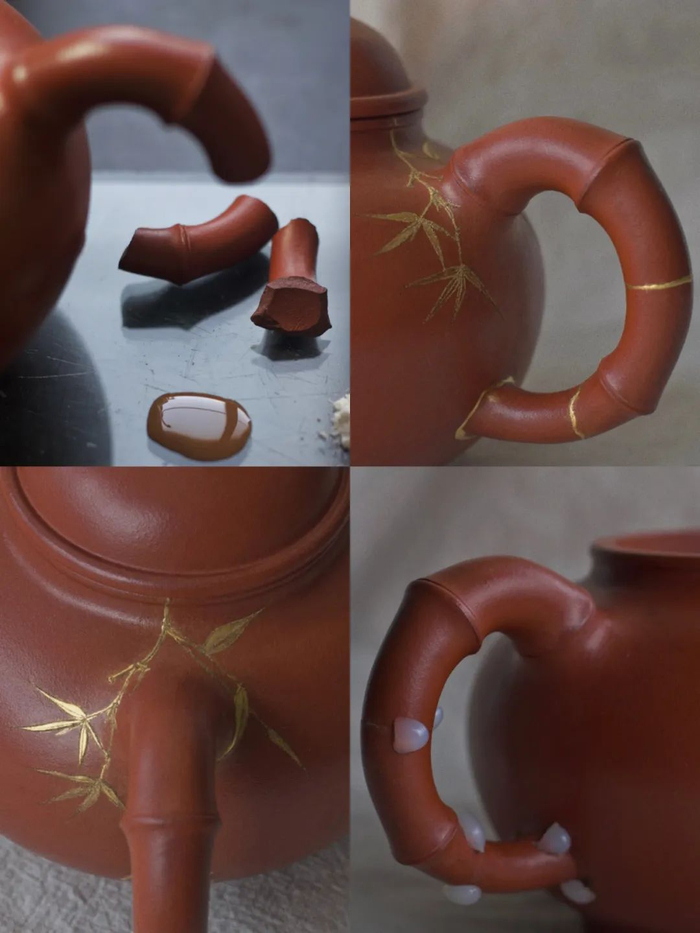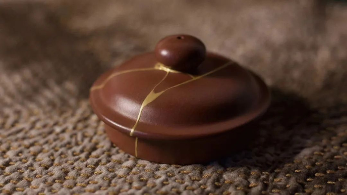 这种修复方式称为金缮,即用天然大漆粘合器物碎片或填充缺口,其间多次打磨、上漆,之后置入固定温度湿度的空间进行阴干,最后在表面敷上金粉或是贴上金箔。