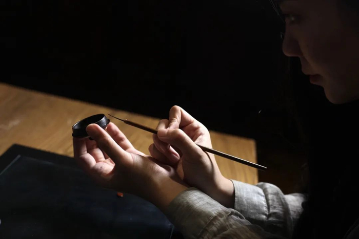 “比如钳子,买回来后我们还要再磨制。因为每批漆的保质期不同,使用的漆也要自己调配。莳绘时,我们都会用自己做的粉筒进行金粉播撒,同时为了让勾线所得效果不同,也要找不同的笔。”晓雨解释道。