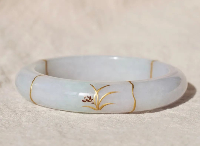 镯子摔坏后,两人先用大漆把碎块进行粘合,又在一处隐裂部位使用金粉,用莳绘手法(工艺相当于用金色描画花纹)修饰了一株兰花——兰花寓意纯洁的情感,表示故人已逝,回忆犹在。