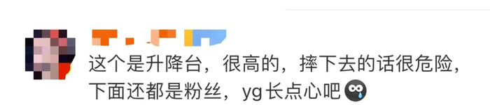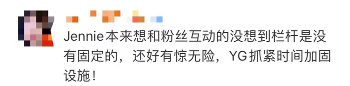视频中,BLACKPINK的四名成员站在升降舞台上表演,该舞台四周有简单的铁栏杆围住。成员Jennie刚用手抓住栏杆,准备抬腿来一段热舞,没想到栏杆突然向外倾倒。