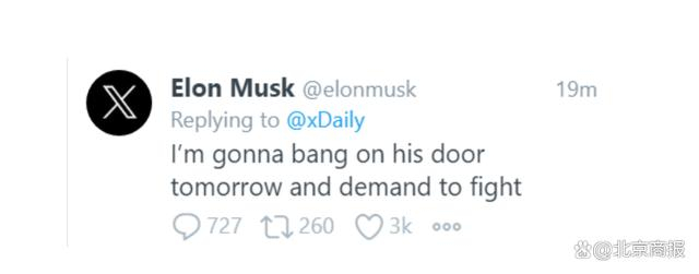 随后,马斯克也在自己的X(推特)平台上向扎克伯格公开叫板,先后回复转发Threads贴文截图的用户说“扎克是个胆小鬼(Zuck is a chicken)”、“我明天就去敲他的门”。