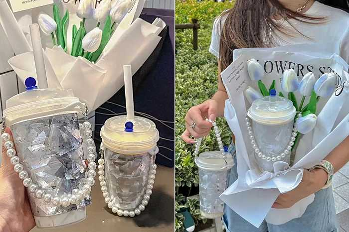 茶百道推出的限定闪闪杯,buling buling的杯套配以大珍珠链子,也在立秋火了一把。其中珍珠手提,既可以当提手,又可以拆卸下来DIY成衣饰、手链、挂件。