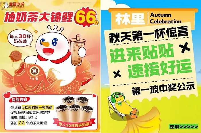 蜜雪冰城的“秋一杯”很让人动心:活动期间,用户在抖音、微博、小红书,带话题“秋天的第一杯奶茶”,发视频/晒图蜜雪冰城奶茶,抽66个奶茶锦鲤,雪王承包1个月的奶茶。