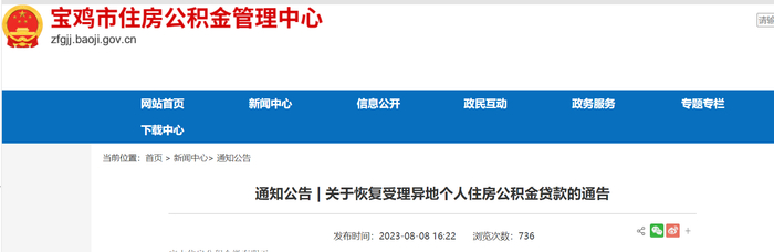 陕西省宝鸡市住房公积金管理中心关于恢复受理异地个人住房公积金贷款的通告