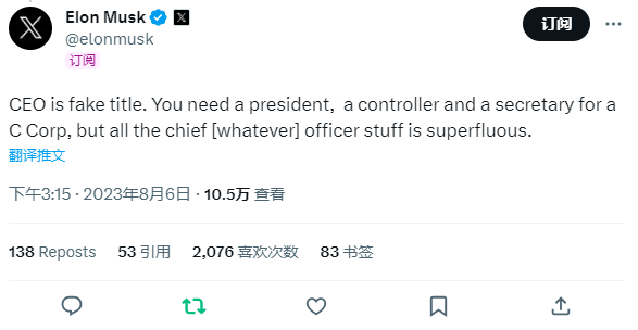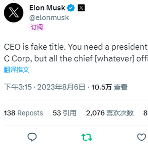 “CEO是一个假头衔。一般股份有限公司(C-Corp)需要一名总裁、一名财务总监和一名秘书,但所有关于首席(不管是什么)官员的东西都是多余的,”马斯克在8月6日周日凌晨写道。