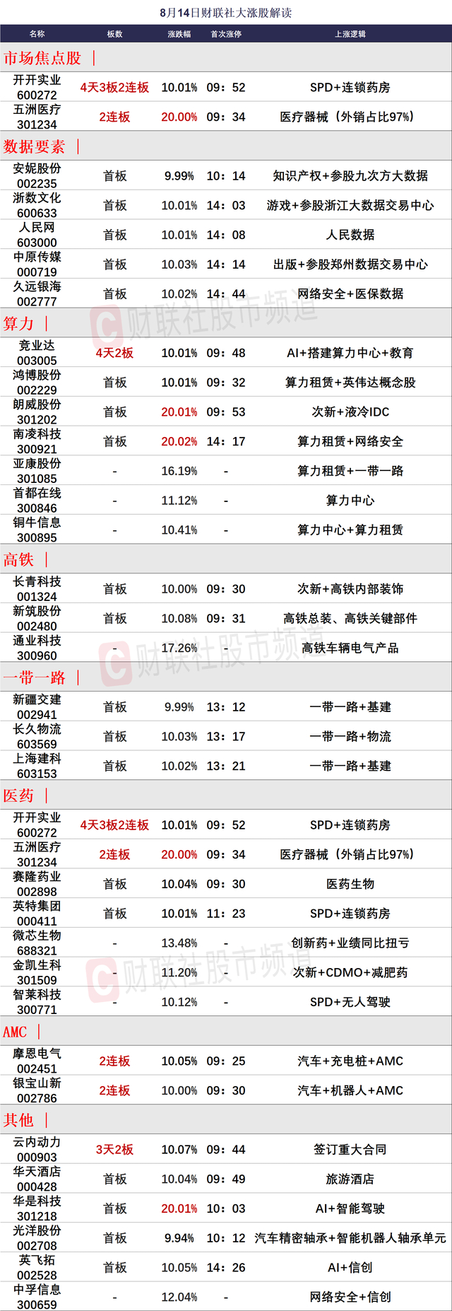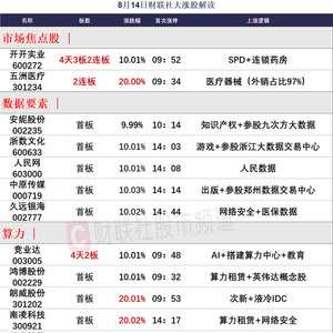 【8月14日涨停分析】今日共25股涨停,连板股总数4只,9股封板未遂,封板率为73%(不含ST股、退市股及未开板新股)。个股方面,SPD概念股开开实业4天3板,医疗器械的五洲医疗创业板2板,AMC概念股摩恩电气2板、银宝山新2板,签订重大合同的云内动力3天2板,算力板块竞业达4天2板、朗威股份创业板首板、南凌科技创业板首板,AI+数据安全的华是科技创业板首板。今日收涨个股2899只,收跌个股1953只。