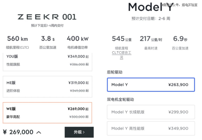 这一轮降价后,极氪001的三款车型售价已经和今天宣布降价的Model Y重合。