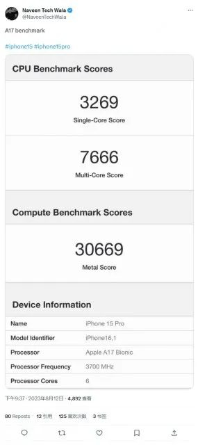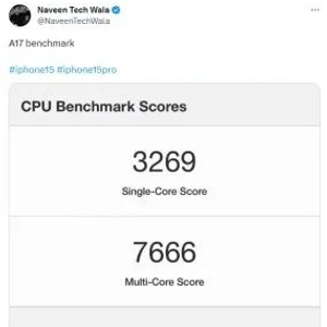 据海外爆料达人@Naveen Tech Wala 最新发布的信息显示,苹果A17芯片在基准测试的单核成绩为3269分,比A16提高了31%。
