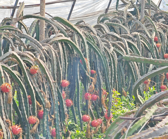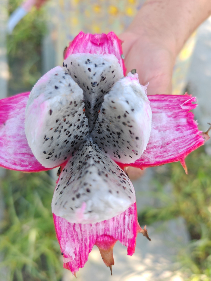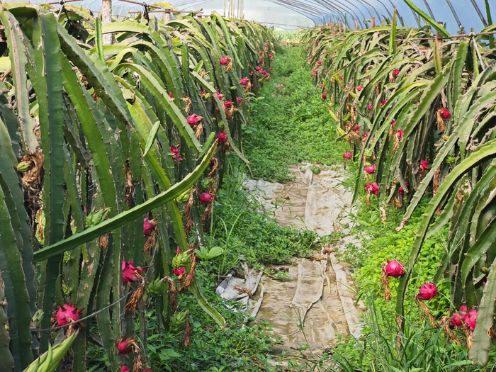 近日,宋志明的火龙果农场里,部分成熟的火龙果格外显眼,老板和老板娘背着塑胶筐在园内穿梭忙碌着,手起刀落之间,一个个成熟的火龙果被采摘入筐。“这批火龙果正值成熟期,欢迎大家来农场实现‘摘果自由’。”62岁的宋志明表示,他种的是“良心果”,坚持人工除草、人工授粉,使用自然发酵的有机肥,结出的火龙果甜度高、口感好。