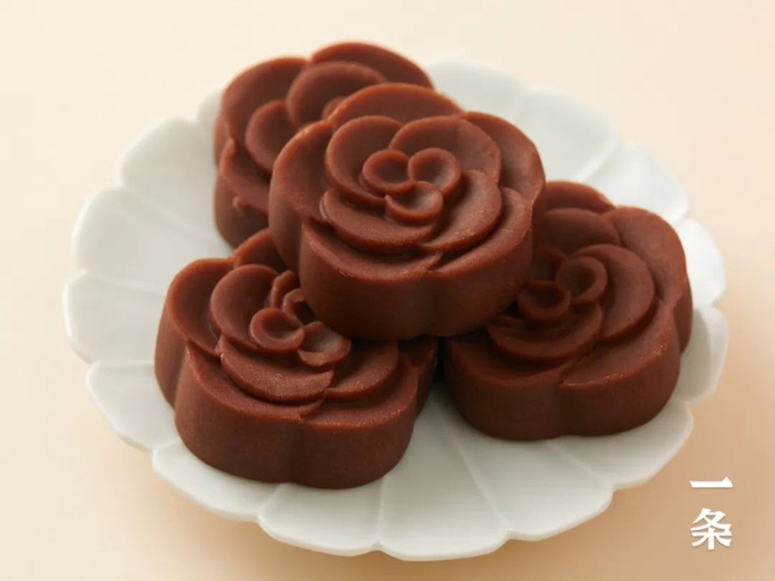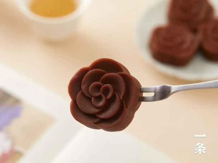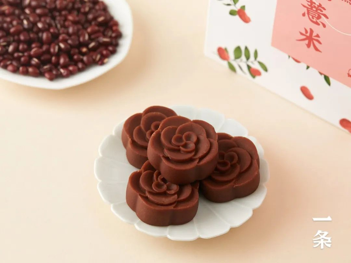 这是一款以红豆为主角的糕点,加入薏米、芡实。深红色玫瑰花的造型,十分雅致,看着便想立刻尝尝。