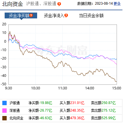 北向资金全天净卖出46.63亿元,其中沪股通净卖出19.86亿元,深股通净卖出26.77亿元。
