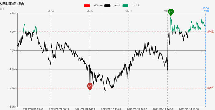 指标显示,市场短线情绪小幅低开后在近期一批热门个股持续活跃带动下迅速拉起至0轴上方。此后盘中基本围绕活跃线展开宽幅震荡,午后AI、中字头等热点进一步扩散,最终短线情绪再度以逼近全天高点报收。