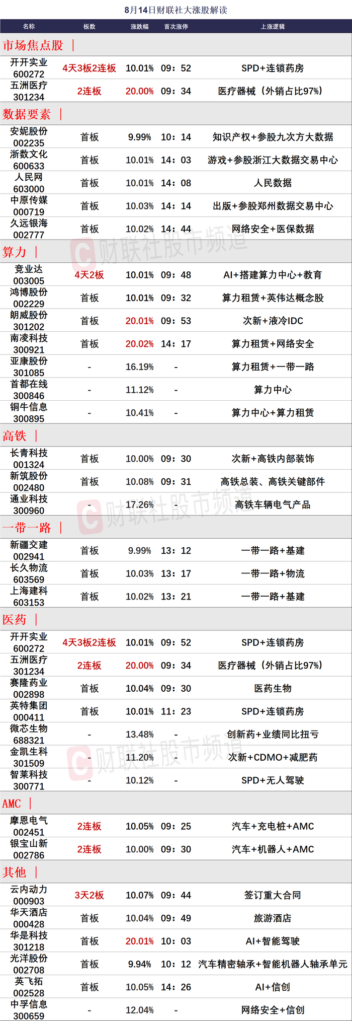 财联社8月14日讯,今日25股涨停,9股炸板,封板率为74%,开开实业4天3板,摩恩电气、银宝山新2连板,云内动力3天2板,竞业达4天2板,华是科技6天2板,南凌科技、朗威股份、五洲医疗20CM首板。盘面上,收涨个股2899只,收跌个股1953只;板块方面,数据确权、算力租赁、网络安全、信创等板块涨幅居前,汽车整车、房地产、CRO、银行等板块跌幅居前。