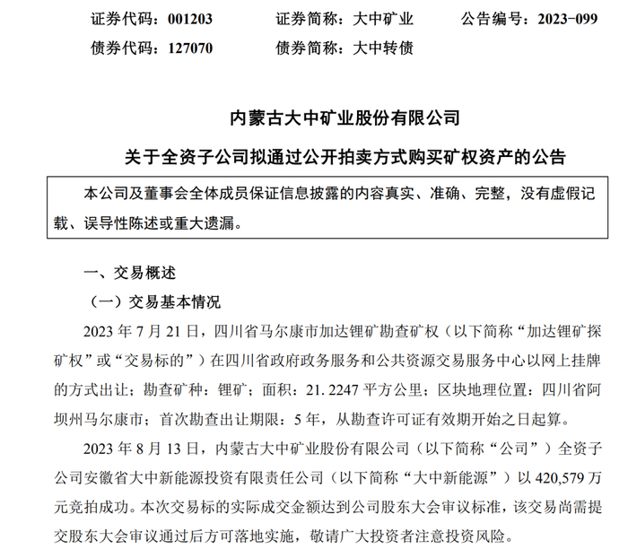 8月14日早间,大中矿业(001203)公告显示,8月13日,全资子公司安徽省大中新能源投资有限责任公司(以下简称“大中新能源”)以42.06亿元竞拍成功。