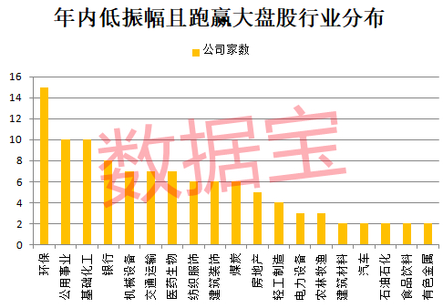 在大盘指数徘徊不前,市场热点持续性不强的背景下,股价波动小且还能跑赢大盘的股票已属稀缺。数据宝统计,不含北交所股票,今年以来振幅在20%以内,且年内涨幅超上证指数的股票有112只。这些股票主要来自环保、公用事业、基础化工行业,其中环保行业入围15只,排在首位。