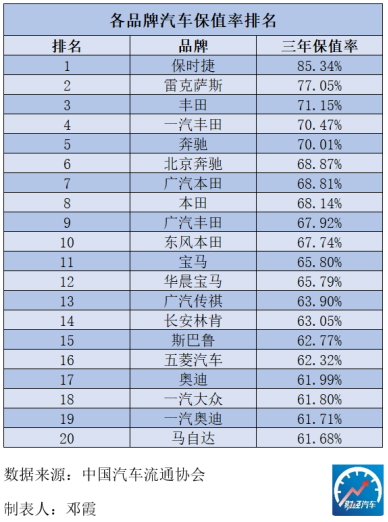 在汽车品牌保值率排名中,第一、第二名的保时捷、雷克萨斯都是豪华品牌,BBA(奔驰、宝马、奥迪)与林肯等豪华车品牌的身影也在其中。