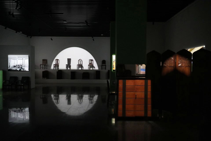 灯光下,八仙桌配上波浪形桌面装饰很是吸睛。这是展厅二楼模拟河滨大楼内景的一件作品。通过切光灯展陈新技术,这里以明暗对比突出展品细部与重点,更方便观众欣赏、理解的同时,也为人们带来更舒适的观展体验。