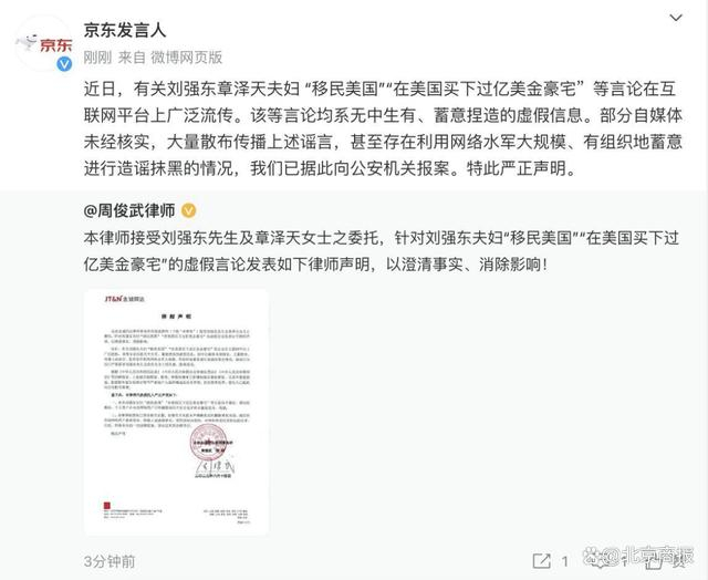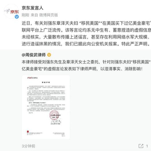 近日,有关刘强东章泽天夫妇 “移民美国”“在美国买下过亿美金豪宅〞等言论在互联网平台上广泛流传。该等言论均系无中生有、蓄意捏造的虚假信息。部分自媒体未经核实,大量散布传播上述谣言,甚至存在利用网络水军大规模、有组织地蓄意进行造谣抹黑的情况,我们已据此向公安机关报案。特此严正声明。