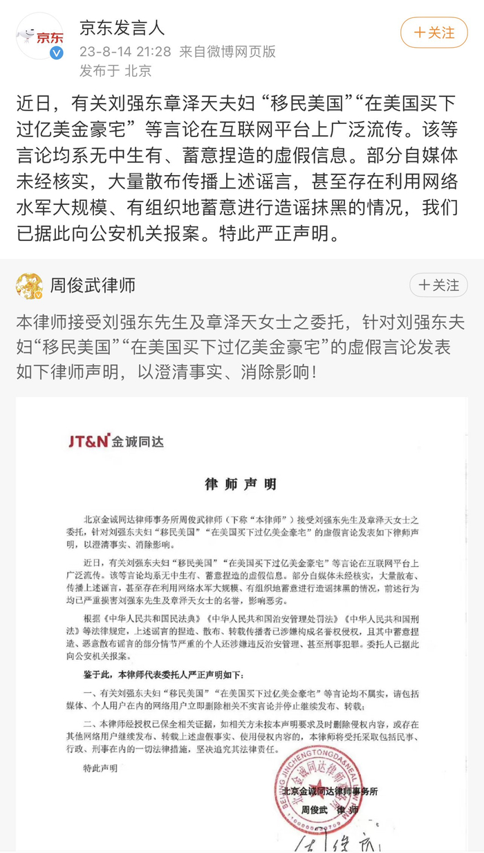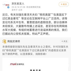 8月14日晚间,刘强东和章泽天通过微博“京东发言人”辟谣表示,近日有关刘强东章泽天夫妇 “移民美国”“在美国买下过亿美金豪宅〞等言论在互联网平台上广泛流传。该等言论均系无中生有、蓄意捏造的虚假信息。部分自媒体未经核实,大量散布传播上述谣言,甚至存在利用网络水军大规模、有组织地蓄意进行造谣抹黑的情况,已据此向公安机关报案。