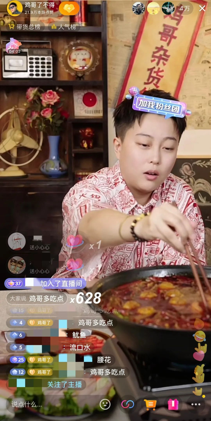 鸡哥的第一场直播带货,直播间布置成了老重庆杂货铺的风格,复古的茶缸、报纸、暖水瓶摆放在周围,以热闹的火锅开局,火辣辣的美食衔接精挑细选的川渝特色选品。没有参加“星跃计划”之前,鸡哥的直播场观最高在线人数也就2万左右,参加了“星跃计划”之后,在平台的助力和自身优质内容等多方面加持下,鸡哥第一场带货直播就达到了5万多人,而且还维持了很长时间,在鸡哥看来这是一个非常大的突破。“在带货之前,我一直担心流量能不能好,会不会影响用户体验,但从反馈结果来看,效果是非常好的。”