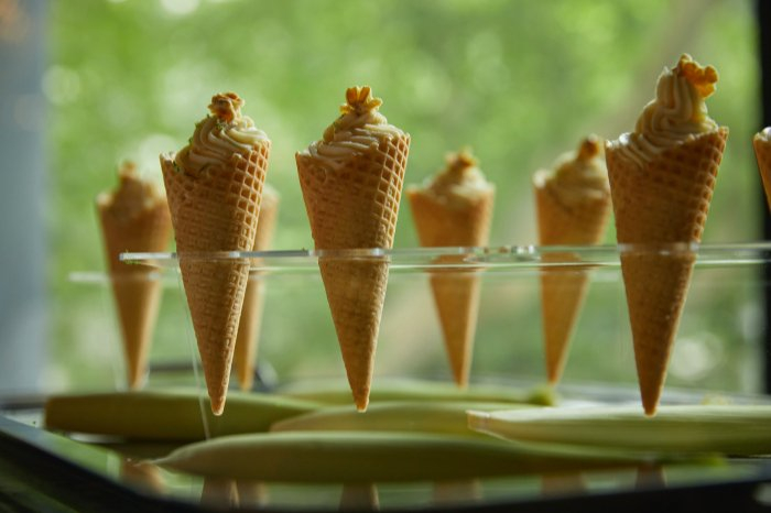 【芝士甜玉米蛋筒】用本地的甜玉米粒加上粉碎后并且融化的马苏里拉芝士,一同充分融合。装在自制的蛋筒里,做成冰淇淋的样子。Topping用嫩玉米汁,加上淡口的芝士,做成芝士酱,再挤在蛋筒上。外观上看是普通的蛋筒冰淇淋,吃时会有拉丝的惊喜,有反差感和戏剧性。