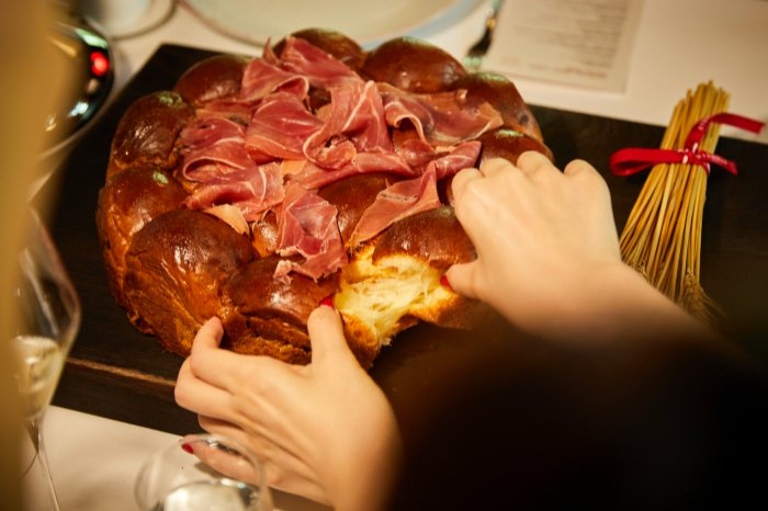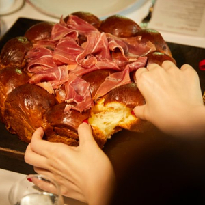 【手工肉松黄油面包】是用法国总统黄油、法国面粉、玉米鸡鸡胸肉做成的肉松烘焙而成的手工肉松黄油面包。传统Brioche是重黄油面包,言盐在此基础上增加了口味的多变性,增加了肉松,除此以外没有额外添加物。这款玉米鸡之前在言盐的大菜单中也有使用,这次纯粹用鸡胸肉来做肉松,胜在鸡肉和油脂的香味。黄油将肉松拌得更为湿润,再用面团包裹后烤,避免肉松外层焦化,掰开Brioche后,内里的肉松依然质地滋润。