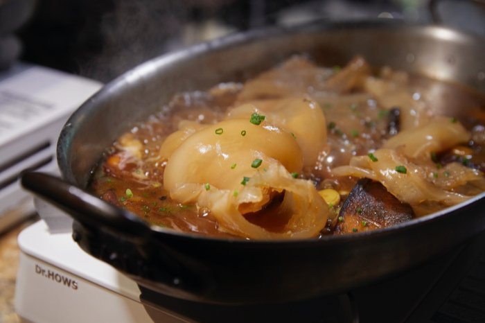 【熟成Prime牛肋排照烧】相比常见的战斧、Porterhouse、肉眼、西冷等部位,言盐这次用了Prime级别的牛肋排。干式熟成的牛肋排,先加牛肉汁和照烧酱汁,进行真空低温慢煮,提升内里熟度,减少后面在烤箱中的步骤时间。照烧酱汁用清酒、味淋、日本低盐酱油、蜂蜜、茄汁调制,再加上用小干葱吸饱自家制的醋点缀,以酸味来平衡油脂与较重的口味。