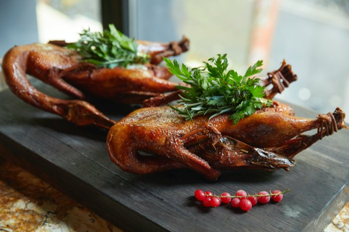 【油淋云南小麻鸭酿糯米芡实甜豆】灵感源于江南的八宝鸭、广东的酿菜与粤菜的脆皮鸡菜式。言盐在测试后选择了云南小麻鸭(又称小刀鸭),重量为1.2-1.5公斤,体型小,肉质嫩,口感好,油脂较少。先腌制入味,用西式低温慢煮,再放入熟成柜后做一夜吊干,减少表皮水分,表皮收缩再以油淋,令表皮脆化。鸭子内腔加入糯米、芡实(鸡头米)以及新鲜甜豆,炒成酿料后回填,增加鸭子的风味。