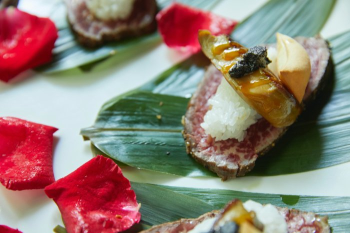 【熟成Infinite M9里脊薄切香煎鸭肝松露寿司】概念源自中国的传统粽子,结合西餐经典菜品罗西尼牛肉。选用先湿式熟成,再短期干式熟成的澳洲Infinite M9的里脊,取其中段部位,让肉的味道更为浓郁。先用熟成牛油,对里脊肉的表皮进行轻煎,里脊冷却,锁住汁水后,再薄切,做成Carpaccio形态。寿司饭用日本秋田小町米,煮得微湿。寿司调味用言盐自家用李子发酵的李子醋,酸味自然。将寿司米饭,铺在牛肉薄片上,再铺上轻煎激发香味的鸭肝,用云南松露自制的松露酱,将粽叶做成底托。